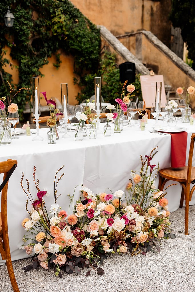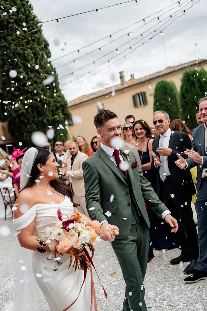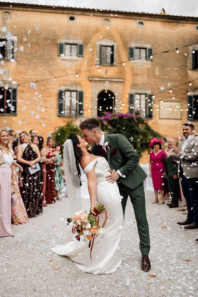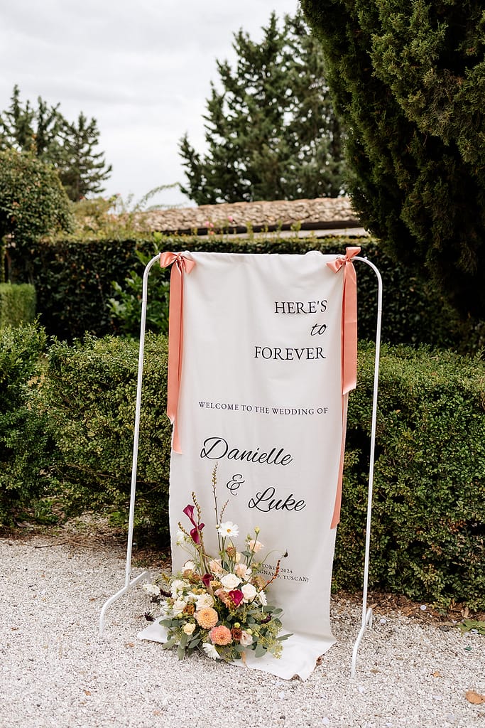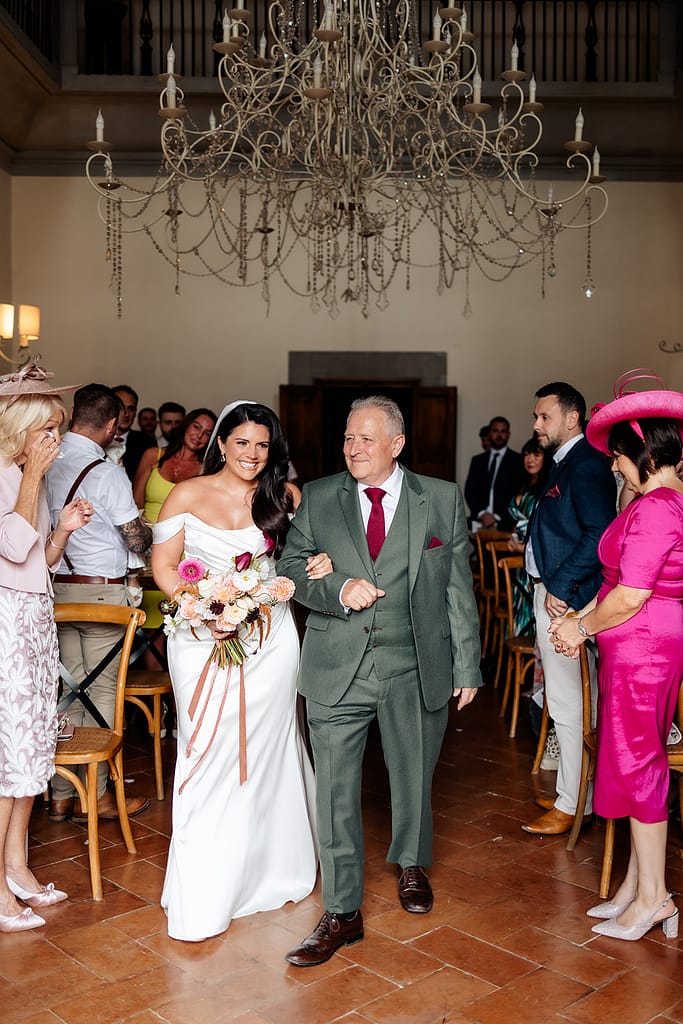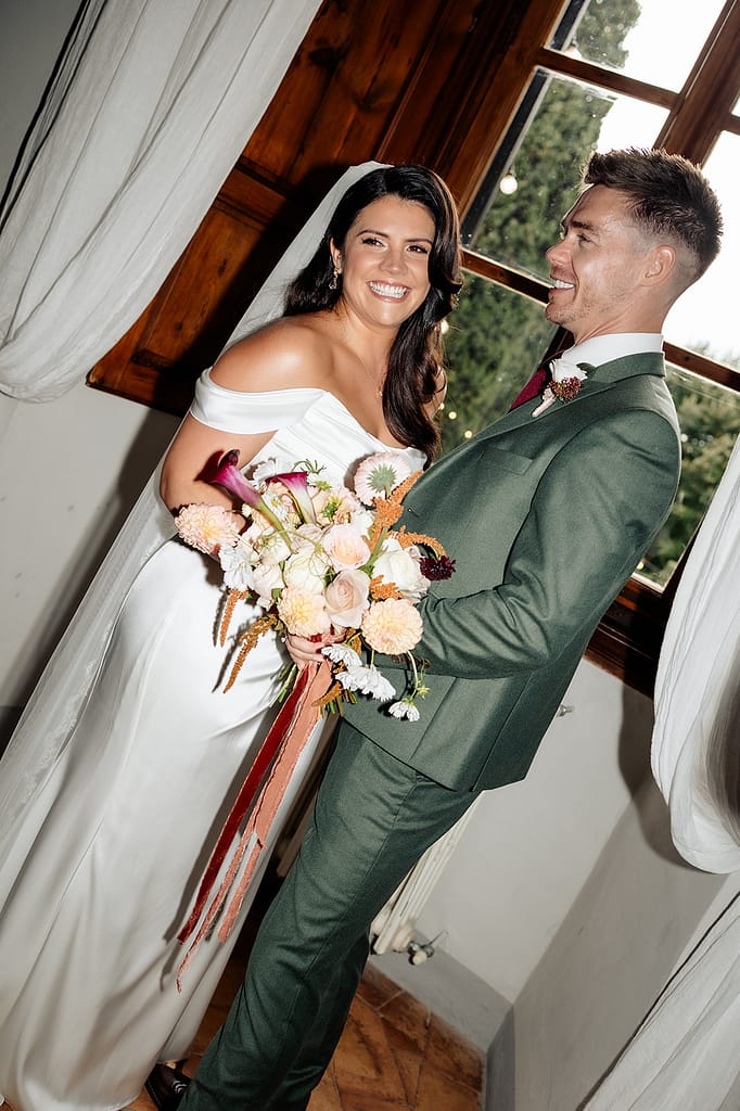 The floral design echoed the landscape: soft peach, auburn, orange, and green tones that melted into the venue’s natural aesthetic. It was Tuscany in colour form, warm, romantic, and alive.